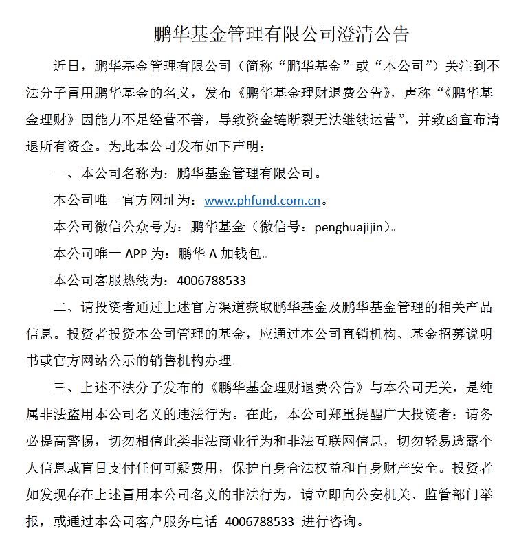 鹏华基金表示,不法分子发布的《鹏华基金理财退费公告》与本公司无关,是纯属非法盗用本公司名义的违法行为。