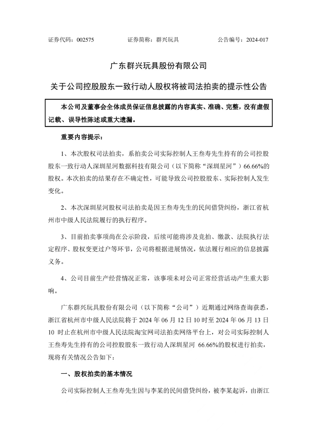6月2日晚,群兴玩具(002575)披露公告称,近期公司通过网络查询获悉,浙江省杭州市中级人民法院将于2024年6月12日至2024年6月13日在杭州市中院淘宝网司法拍卖网络平台上,对公司实际控制人王叁寿持有的公司控股股东一致行动人深圳星河66.66%的股权进行拍卖。