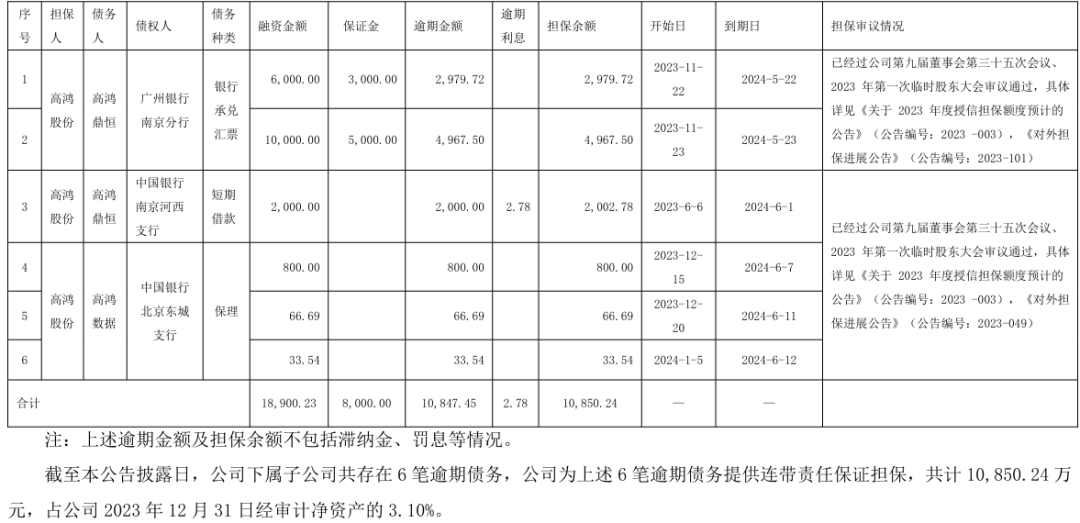 根据公告,ST高鸿为两家子公司高鸿数据、高鸿鼎恒担保的6笔债务,在5月22日至6月12日期间相继到期,目前6笔债务均逾期,共计1.09亿元,占公司2023年12月31日经审计净资产的3.10%。