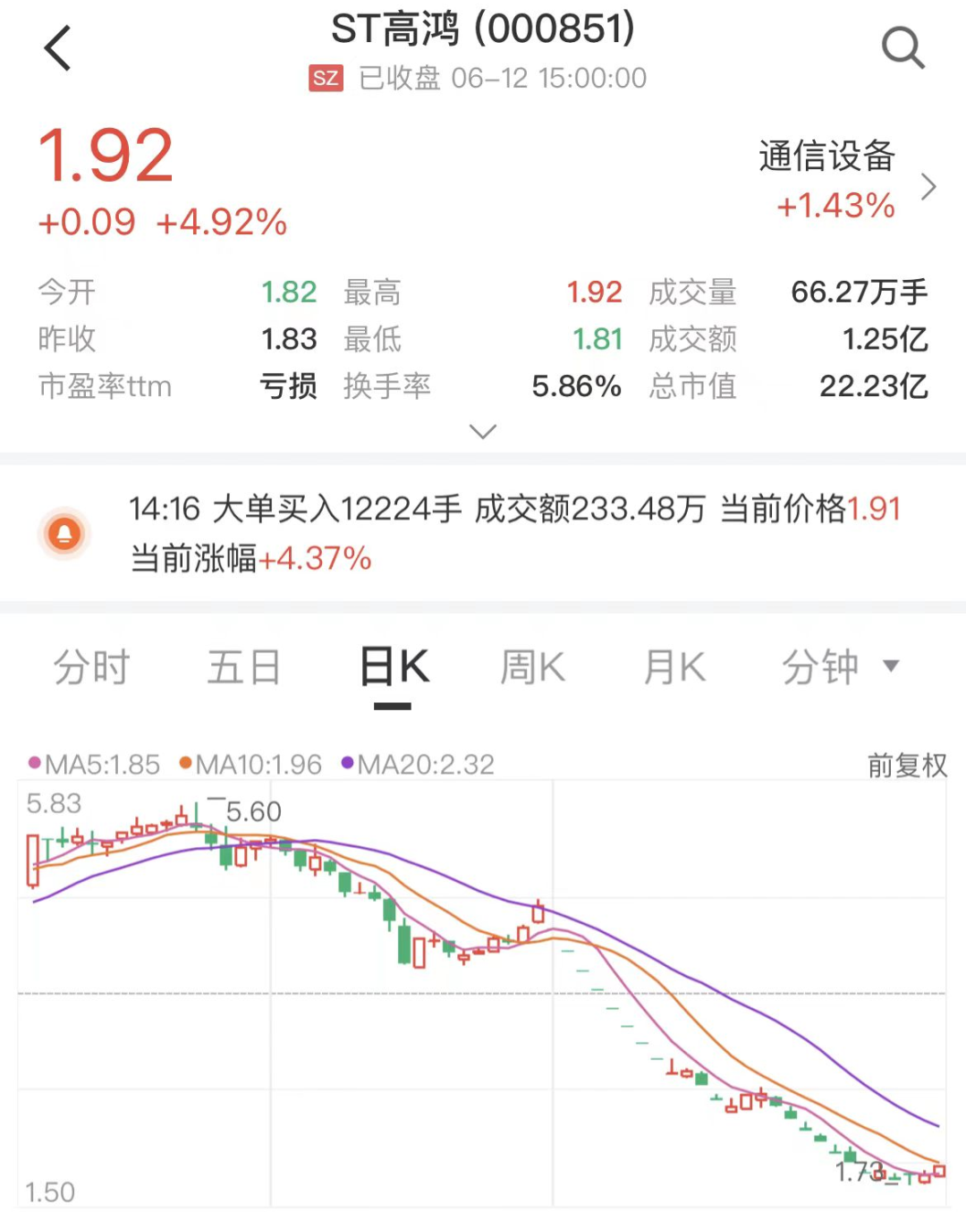 5月份,公司还因信息披露不准确收到贵州证监局发来的警示函。在过去的27个交易日里,ST高鸿股价曾出现17个跌停,并在6月7日创下历史新低1.73元/股。