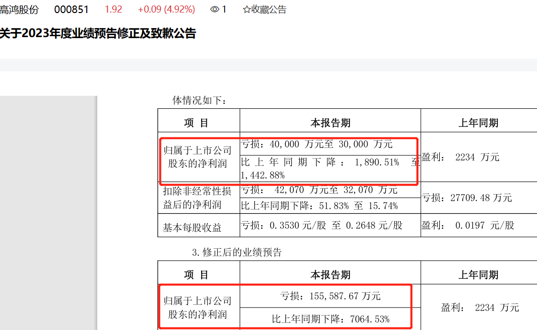就在年报披露当天,ST高鸿发布了业绩预告修正及致歉公告,修正前,公司预计2023年亏损3亿元至4亿元,修正后预计亏损15.56亿元。修正的原因主要是在年度审计过程中,公司对资产进行了梳理,对个别应收账款进行了审慎考量,增加计提了坏账准备;对部分存货计提了跌价准备;对长期资产(商誉、在建工程)聘请了评估机构进行减值测试并计提了减值。
