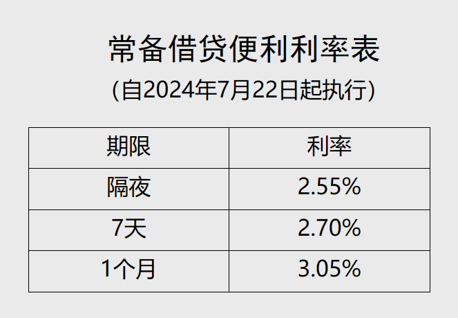据人民银行网站7月22日公布,常备借贷便利利率自7月22日起下调,隔夜、7天、1个月期限品种分别降至2.55%、2.7%、3.05%,均下调10个基点。