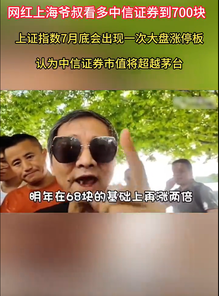 上海爷叔在视频中表示,继续上调中信证券目标价到700块左右,认为中信证券将超越茅台成为A股市值最大的股票。同时他预测上证指数7月底会到3300点以上,月底最后三个交易日,即7月29号、30号、31号期间会出现一次大盘涨停板。
