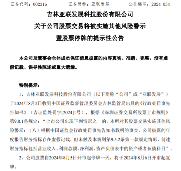 亚联发展公告称,公司8月2日收到吉林证监局出具的《行政处罚事先告知书》显示,监管查明公司涉嫌存在六项违法事实,均与公司原控股子公司开店宝科技集团有限公司(以下简称开店宝)有关。