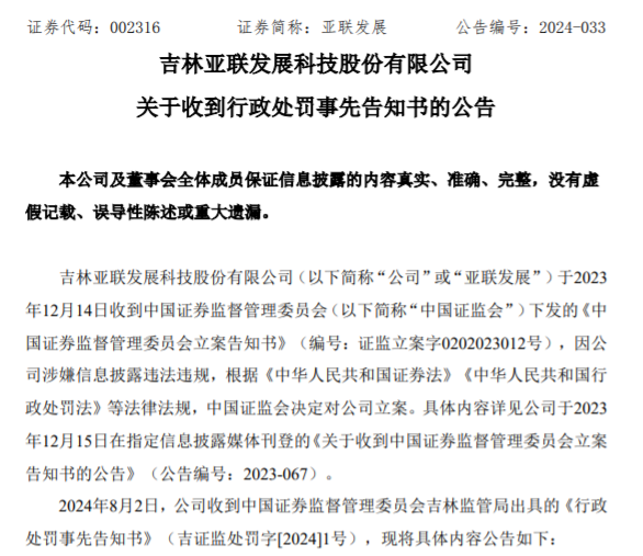 《行政处罚事先告知书》显示,吉林证监局依据《证券法》第一百九十七条第二款规定,拟决定对亚联发展、亚联发展董事长王永彬、亚联发展原财务总监陈道军给予警告,并分别处以200万元、60万元、50万元罚款。