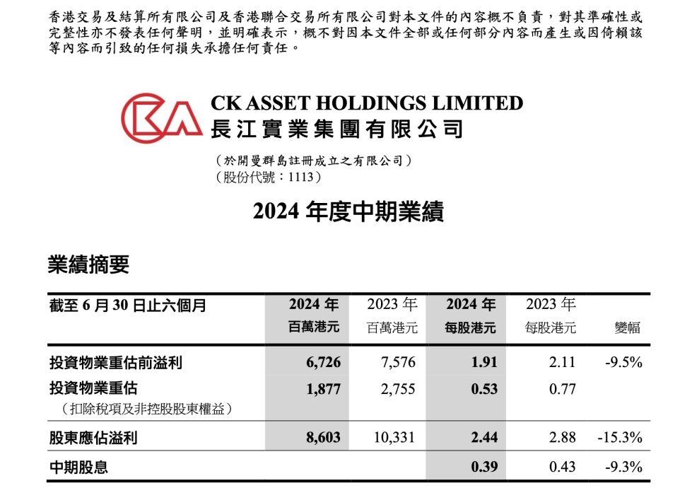 长实集团:今年首六个月净利同比下降15.3%