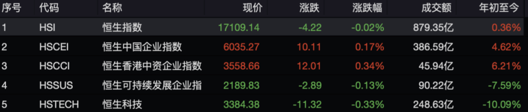 8月15日,港股三大指数涨跌不一。其中,恒生指数收跌0.02%,报17109.14点;恒生科技指数收跌0.33%,报3384.38点;恒生国企指数收涨0.17%,报6035.27点。全天大市成交879.35亿港元,南向资金净买入66.35亿港元。