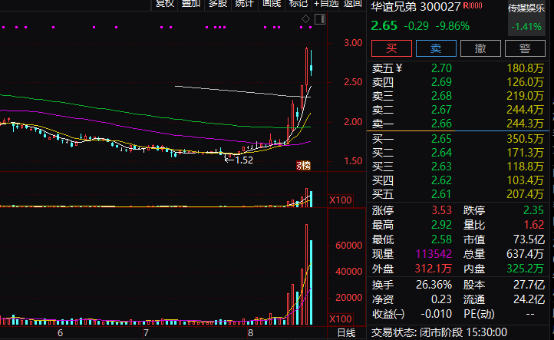 此前连续两天大涨的华谊兄弟(300027)今天则出现调整,收盘股价大跌9.86%。华谊兄弟8月20日晚间发布公告称,公司董事会确认,公司目前没有任何根据《深圳证券交易所创业板股票上市规则》等有关规定应予以披露而未披露的事项或与该事项有关的筹划、商谈、意向、协议等;董事会也未获悉本公司有根据《深圳证券交易所创业板股票上市规则》等有关规定应予以披露而未披露的、对本公司股票及其衍生品种交易价格产生较大影响的信息;公司前期披露的信息不存在需要更正、补充之处。