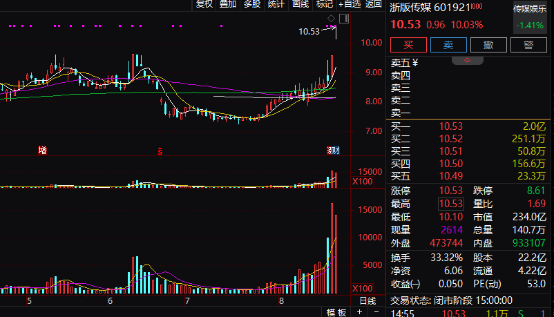 浙版传媒(601921)收盘再度涨停,这是该股连续第二个交易日涨停。浙版传媒近日在上证e互动平台回复表示,公司旗下浙江出版集团数字传媒有限公司是游戏《黑神话:悟空》出版方,负责游戏内容审核、出版申报及出版物号申领工作。