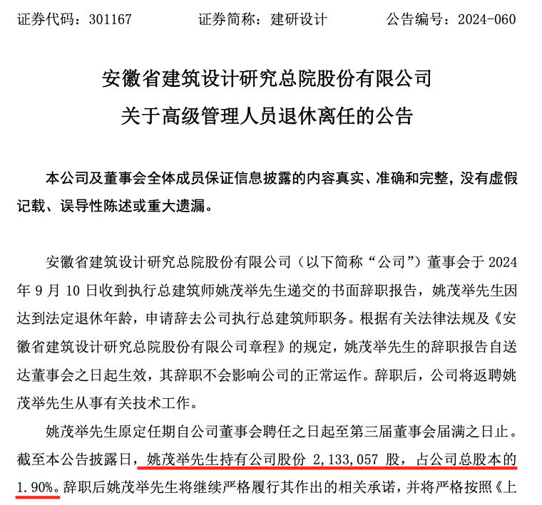 上市公司表示,姚茂举在公司工作已三十六载,几十年来始终恪尽职守、勤勉尽责,是公司建筑设计业务领域的核心人才,为公司发展做出了卓越贡献。