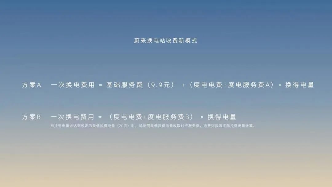 9月15日,蔚来宣布调整换电服务费收费模式,由“一口价”模式调整为“按度收费”模式,单次换电费用为度电电费加度电服务费后乘以换得电量。
