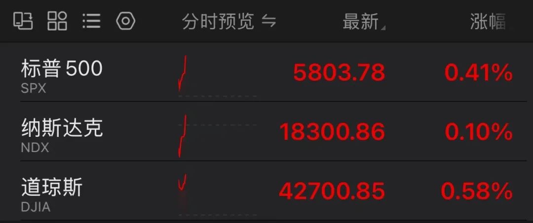 10月11日,美股三大指数集体拉升,道琼斯指数触及盘中历史新高,最新涨幅为0.58%。