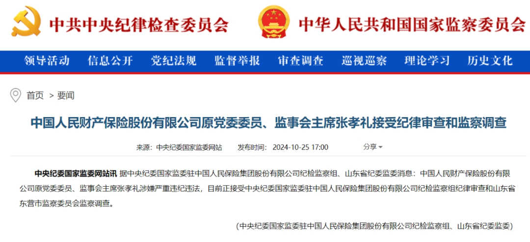 据中央纪委国家监委驻中国人民保险集团股份有限公司纪检监察组、山东省纪委监委消息:中国人民财产保险股份有限公司原党委委员、监事会主席张孝礼涉嫌严重违纪违法,目前正接受中央纪委国家监委驻中国人民保险集团股份有限公司纪检监察组纪律审查和山东省东营市监察委员会监察调查。