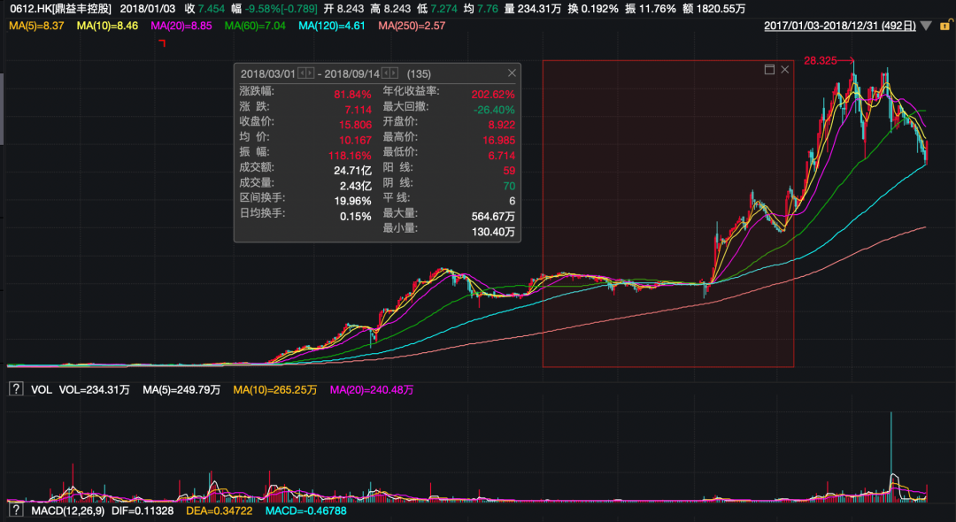 鼎益丰控股于2002年1月登陆港交所。从股价表现来看,在2018年前两月,其均价约为7.2港元/股,3月1日为8.82港元/股,至9月14日达15.8港元/股,区间涨幅超80%。