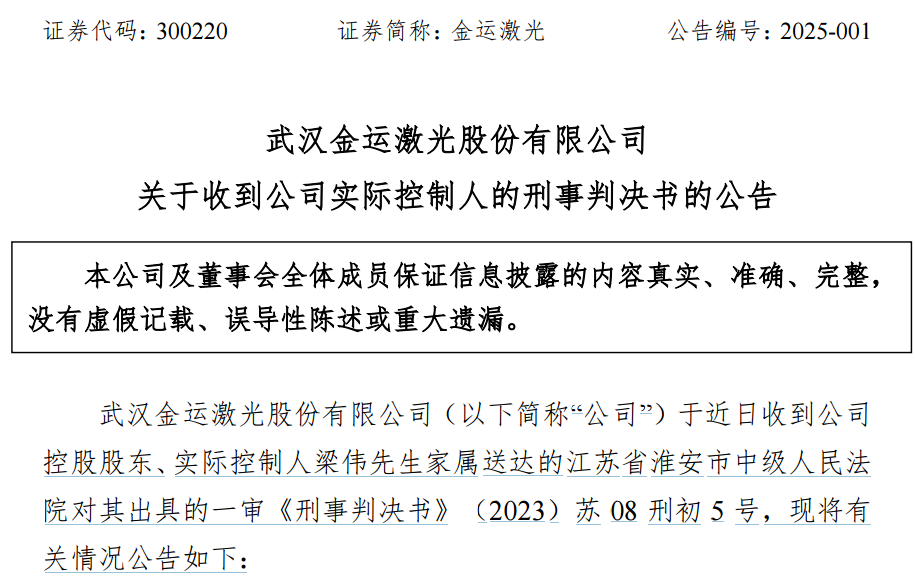 金运激光公告称,近日,江苏省淮安市中级人民法院对梁伟出具的一审《刑事判决书》,已由梁伟家属转送至公司。