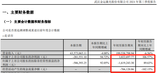 2024年前三季度,金运激光实现归母净利润102.27万元,同比增长106.57%;扣非后净利润为-161.92万元,亏损幅度同比显著缩小。
