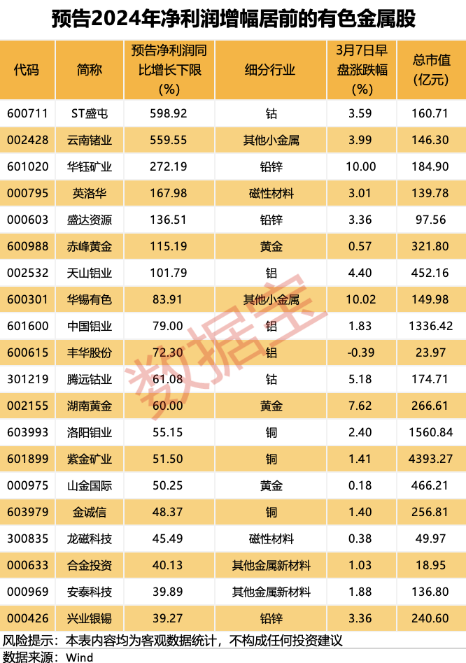 以预告净利润同比增长下限来看,业绩预增的上市公司中,ST盛屯(600711)、云南锗业(002428)、华钰矿业(601020)等7股预计增幅超100%。