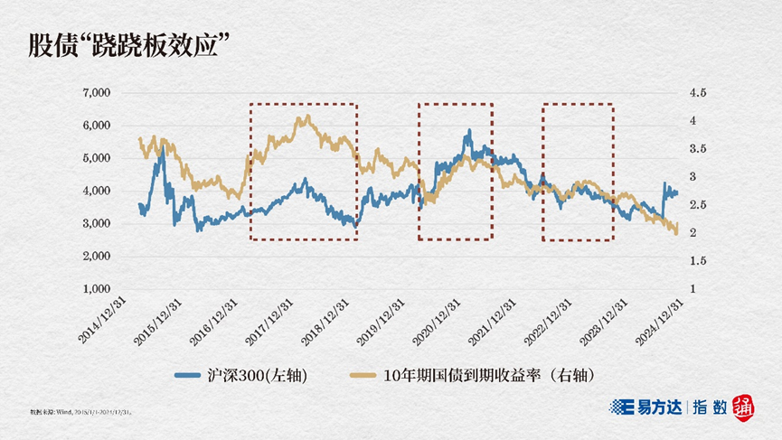 股票、债券这两类资产就基本满足这个条件。很多小伙伴可能听过“股债跷跷板效应”,指的是股市和债市此起彼伏、此消彼长的现象。