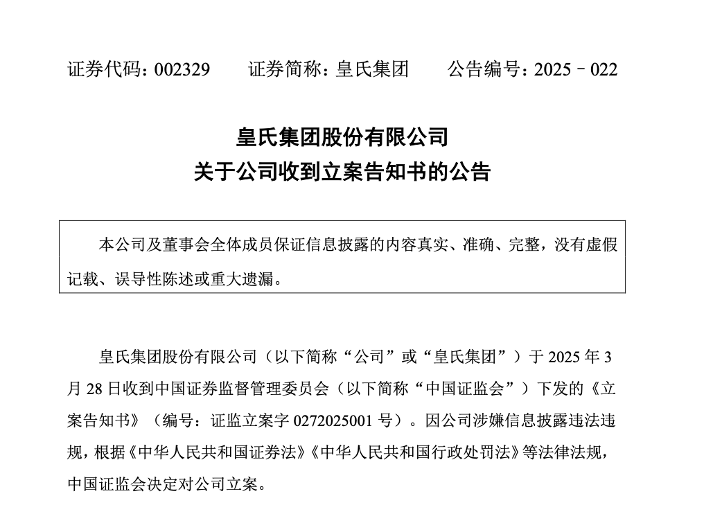 3月31日盘后,皇氏集团(002329)发布公告称,公司于3月28日收到中国证监会下发的《立案告知书》。因公司涉嫌信息披露违法违规,根据《中华人民共和国证券法》《中华人民共和国行政处罚法》等法律法规,中国证监会决定对公司立案。