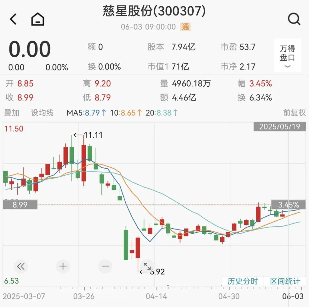 截至5月19日收盘,慈星股份股价报收于8.99元/股,总市值为71亿元。