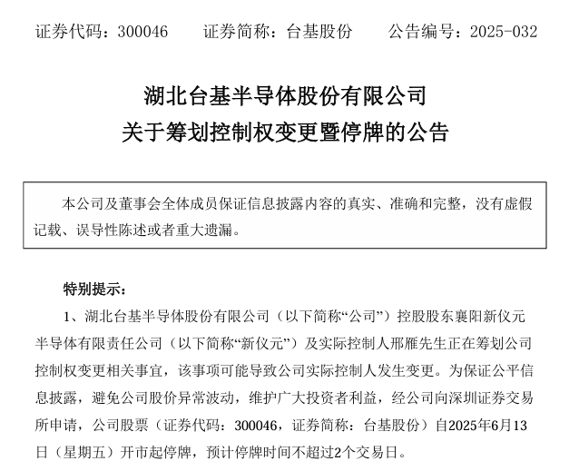 6月12日晚间,台基股份(300046)(300046)公告称,公司控股股东新仪元及实际控制人邢雁正在筹划公司控制权变更相关事宜,该事项可能导致公司实际控制人发生变更。经向深交所申请,公司股票自6月13日开市起停牌,预计停牌时间不超过2个交易日。