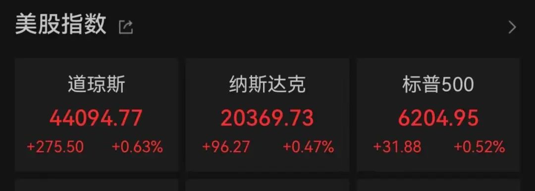 截至收盘,道琼斯指数涨0.63%,标普500指数涨0.52%,纳斯达克指数涨0.47%。