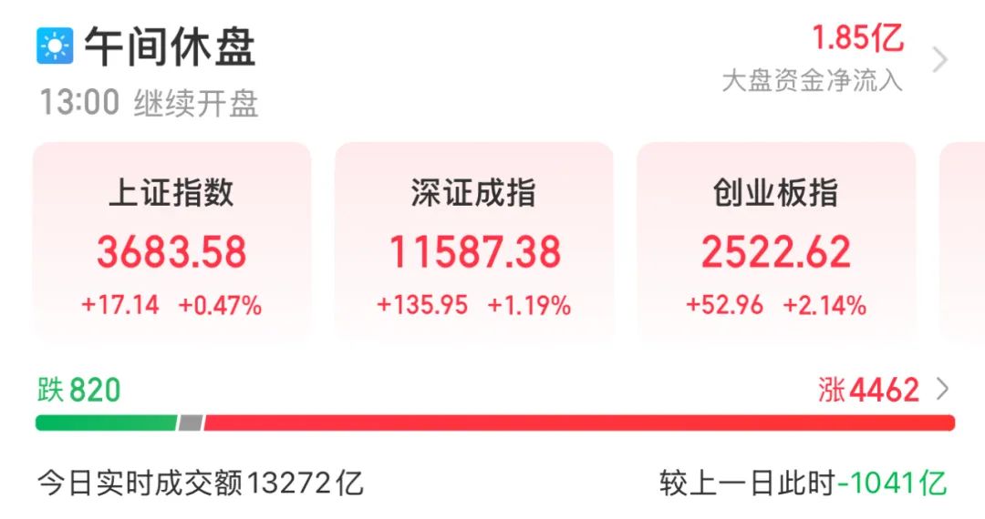 上午收盘,上证指数上涨0.47%,深证成指上涨1.19%,创业板指上涨2.14%。