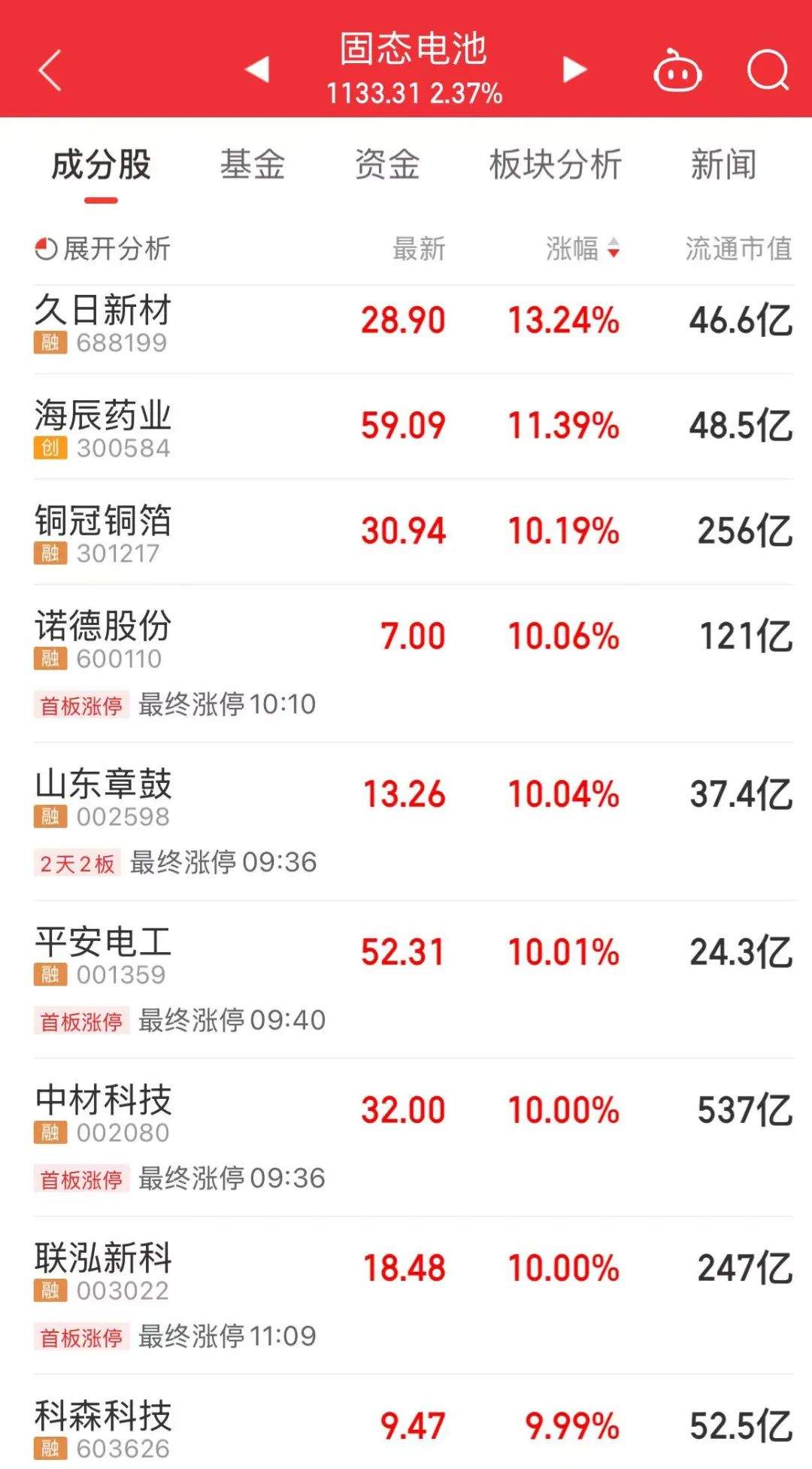 固态电池板块上涨