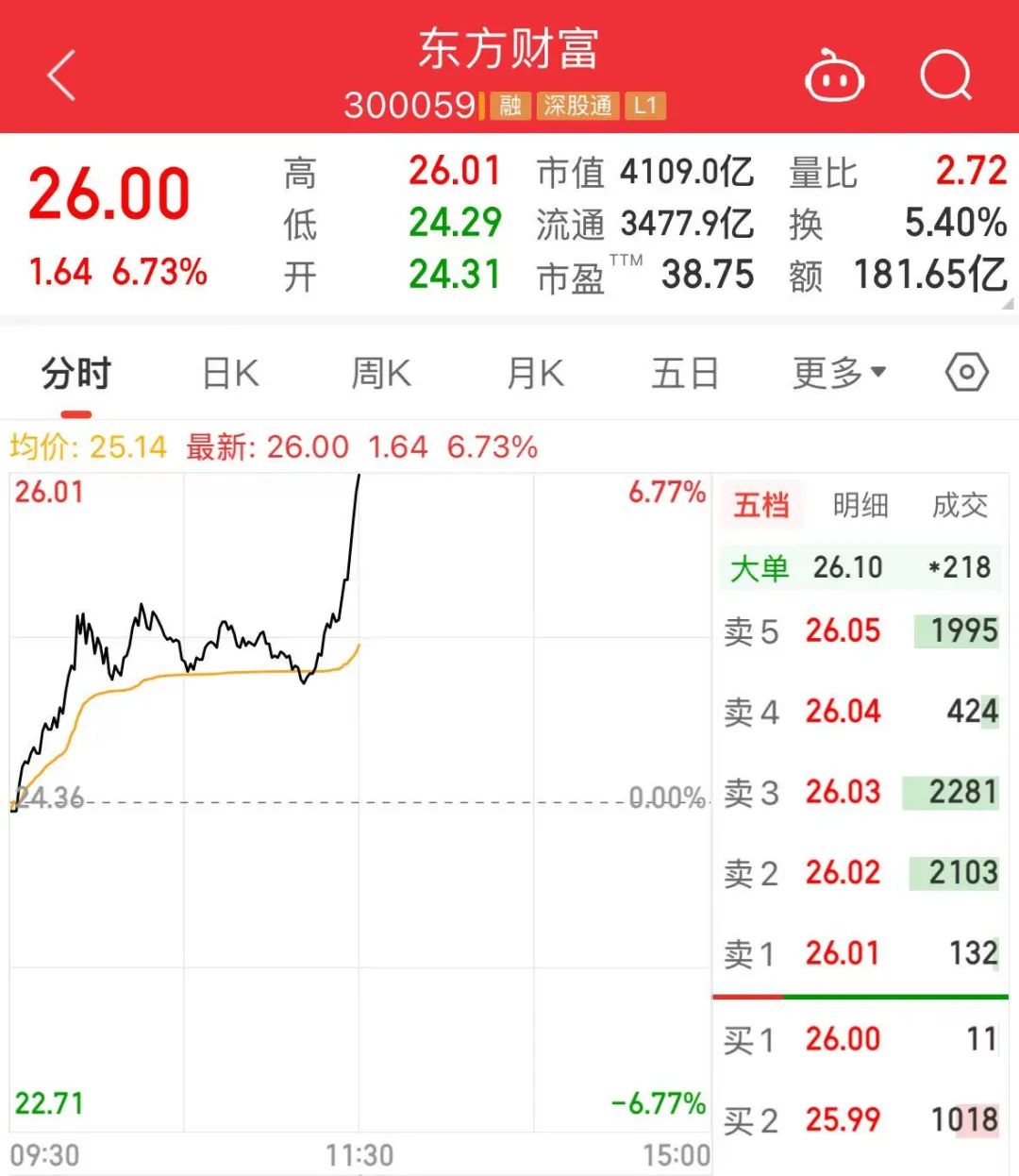 临近上午收盘时,大金融异动,券商、互联网金融板块率先发力,带动指数涨幅扩大。同花顺(300033)、指南针(300803)等个股大涨,长城证券(002939)、天风证券(601162)涨停,东方财富(300059)(300059)上涨6.73%,成交额为181.65亿元,居A股第一。