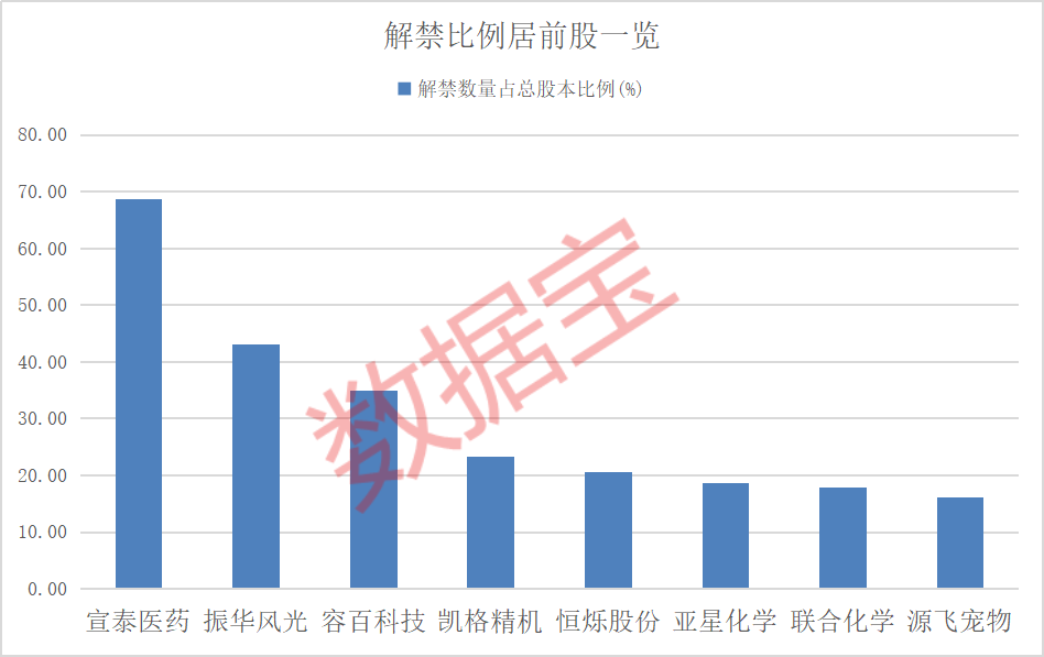 从解禁比例来看,宣泰医药的解禁比例居首,达68.61%,振华风光、容百科技、凯格精机(301338)的解禁比例居前。