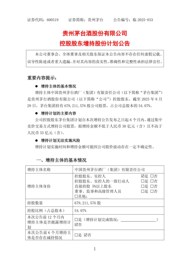 此次增持事项,贵州茅台曾于8月29日进行披露。茅台集团拟在2025年9月1日至2026年2月28日期间,通过上海证券交易所系统以集中竞价交易方式增持公司股票,增持金额不低于30亿元且不高于33亿元,拟增持股份资金来源为自有资金和自筹资金。