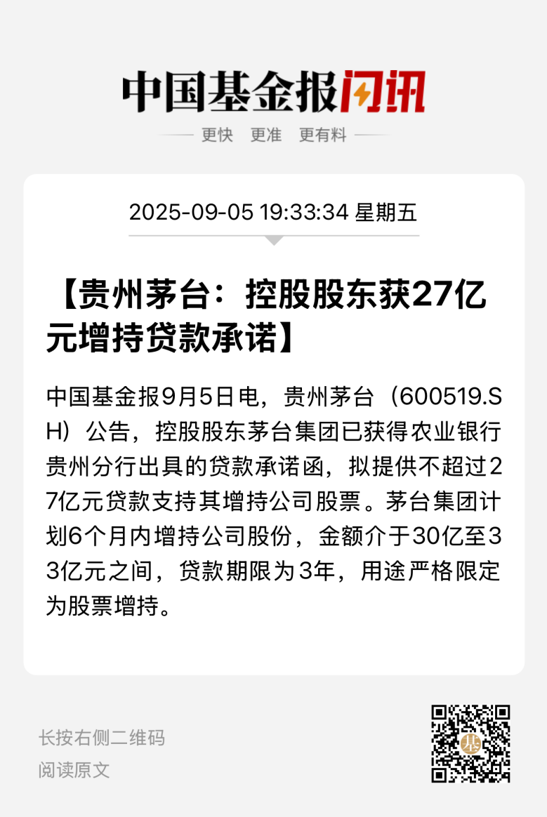 【导读】贵州茅台控股股东获不超27亿元增持股份贷款承诺函