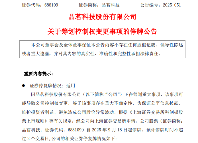 9月17日晚,品茗科技(688109)公告,因公司正在筹划重大事项,该事项可能导致公司控制权变更,公司股票自2025年9月18日起停牌,预计停牌时间不超过2个交易日。