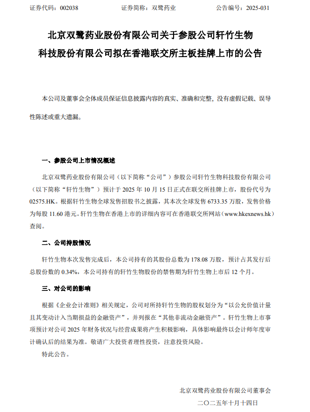 10月13日电,双鹭药业10月13日公告,公司参股公司轩竹生物科技股份有限公司(简称“轩竹生物”)预计于2025年10月15日正式在香港联交所主板挂牌上市。轩竹生物本次发售完成后,公司持有的其股份总数为178.08万股,预计占其发行后总股份数的0.34%。