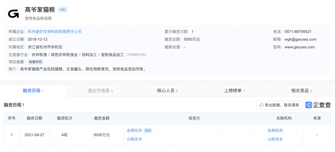 记者关注到,“高爷家”品牌在电商平台拥有较高知名度,主要销售猫粮产品。以天猫平台为例,高爷家天猫旗舰店拥有34.3万粉丝,天猫旗舰店背后的企业为杭州望妙生物科技有限责任公司,该公司为杭州高爷家有好多猫宠物食品有限责任公司的全资子公司。据企查查,杭州望妙生物科技有限责任公司已于2021年进行A轮融资,融资金额5000万元,投资方包括金鼎投资、众晖资本。