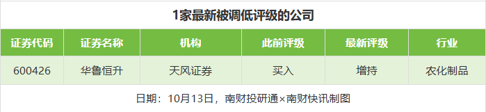 评级调低方面,10月13日,券商调低1家上市公司评级,天风证券(601162)对华鲁恒升(600426)的评级从“买入”调低至“增持”。