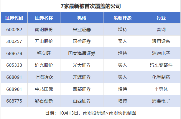 首次覆盖方面,10月13日券商共给出了7次首次覆盖,其中南钢股份获得兴业证券给予“增持”评级,开山股份(300257)获得国盛证券给予“买入”评级,福立旺获得国泰海通证券给予“增持”评级,沪光股份获得光大证券给予“买入”评级,上海谊众获得开源证券给予“买入”评级。