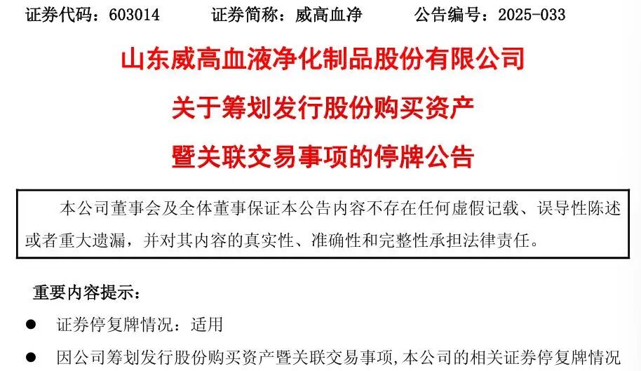 在公告中,威高血净披露,本次交易尚处于筹划阶段,有关事项存在不确定性。为了维护投资者利益,保证公平信息披露,避免对公司股价造成重大影响,根据相关规定,公司股票自2025年10月20日(星期一)开市起停牌,预计停牌时间不超过10个交易日。