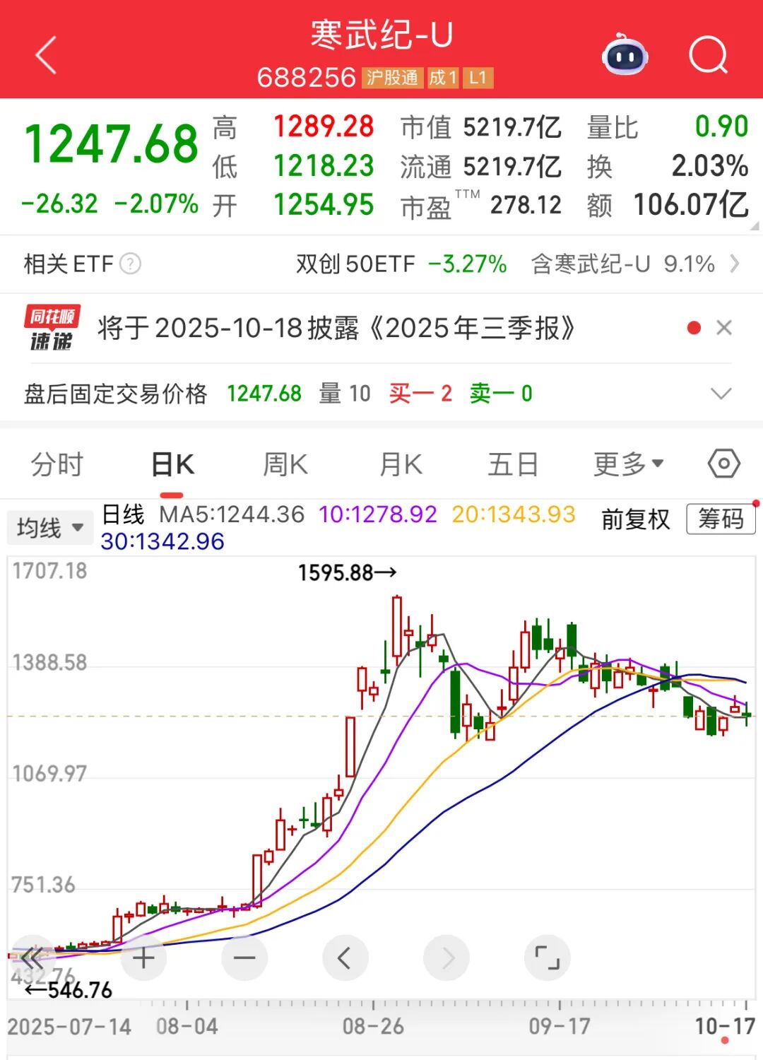 今年8月底,寒武纪-U股价一度上涨至最高价1595.88元/股,超越贵州茅台(600519),成为A股股价最高的个股。