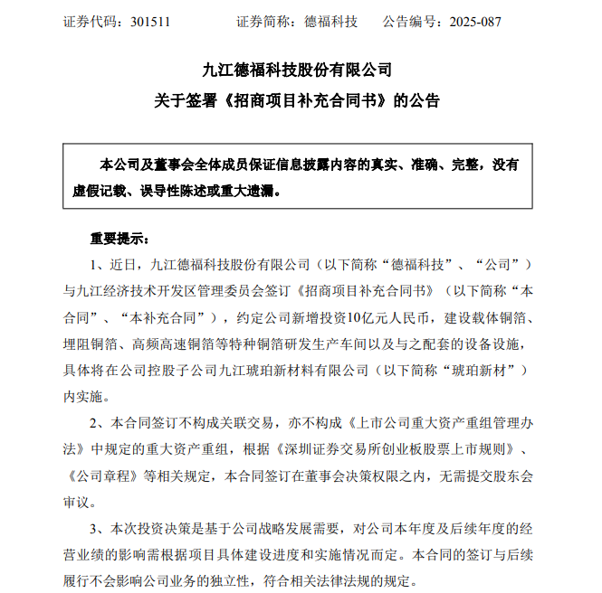 10月22日,德福科技(301511)公告称,公司与九江经济技术开发区管理委员会签订《招商项目补充合同书》,新增投资10亿元建设载体铜箔、埋阻铜箔、高频高速铜箔等特种铜箔研发生产车间以及与之配套的设备设施,具体将在公司控股子公司九江琥珀新材料有限公司内实施。该合同签订不构成关联交易,亦不构成重大资产重组,无需提交股东会审议。投资决策基于公司战略发展需要,对公司本年度及后续年度的经营业绩的影响需根据项目具体建设进度和实施情况而定。