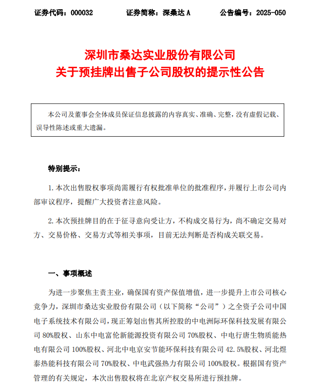 深桑达A发布公告,为进一步聚焦主责主业,确保国有资产保值增值,进一步提升上市公司核心竞争力,公司全资子公司中国电子系统技术有限公司,现正筹划出售其所控股的中电洲际环保科技发展有限公司80%股权、山东中电富伦新能源投资有限公司70%股权、中电行唐生物质能热电有限公司100%股权、河北中电京安节能环保科技有限公司42.5%股权、河北煜泰热能科技有限公司70%股权、中电武强热力有限公司100%股权。根据国有资产管理的有关规定,本次出售股权将在北京产权交易所进行预挂牌。