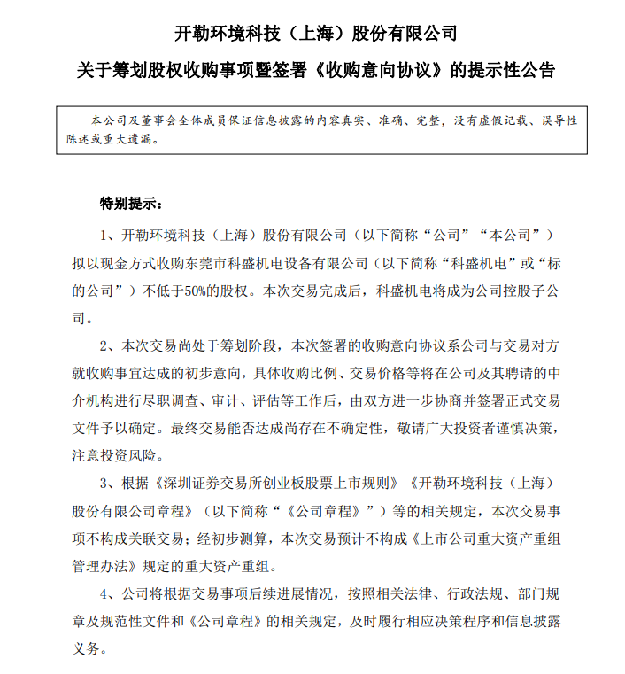 10月22日晚,开勒股份公告称,拟以现金方式收购东莞市科盛机电设备有限公司(简称“科盛机电”)不低于50%股权。交易完成后,科盛机电将成为开勒股份控股子公司。