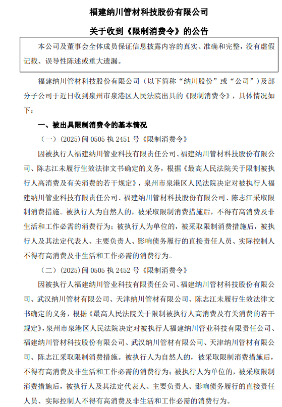 最新公告披露的《限制消费令》提到,泉州市泉港区人民法院决定对被执行人福建纳川管业科技有限责任公司、福建纳川管材科技股份有限公司(即ST纳川)、陈志江采取限制消费措施;泉州市泉港区人民法院决定对被执行人福建纳川管业科技有限责任公司、福建纳川管材科技股份有限公司、武汉纳川管材有限公司、天津纳川管材有限公司、陈志江采取限制消费措施。