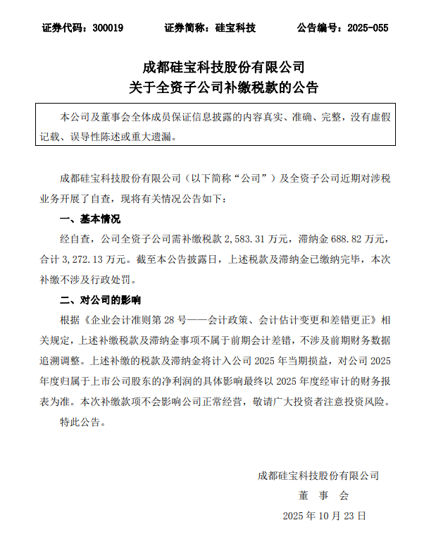 10月23日,硅宝科技早间公告,经自查,公司全资子公司需补缴税款2583.31万元,滞纳金688.82万元,合计3272.13万元。截至本公告披露日,上述税款及滞纳金已缴纳完毕,本次补缴不涉及行政处罚。