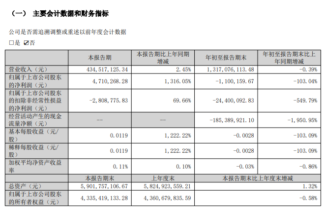 10月22日,宏源药业(301246)发布公告,第三季度营收为4.35亿元,同比增长2.45%;净利润为471.03万元,同比增长1,316.05%。前三季度营收为13.17亿元,同比下降0.39%;净利润亏损110.02万元,同比下降103.04%。