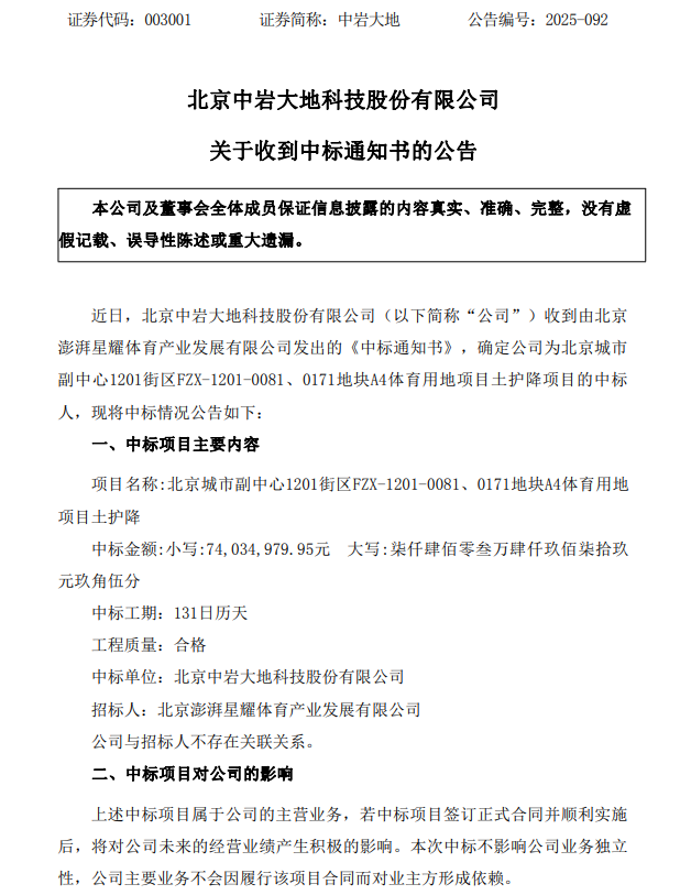 10月22日,中岩大地(003001)公告称,公司收到由北京澎湃星耀体育产业发展有限公司发出的《中标通知书》,确定公司为北京城市副中心1201街区FZX-1201-0081、0171地块A4体育用地项目土护降项目的中标人,中标金额为7403.5万元。该项目属于公司主营业务,若中标项目签订正式合同并顺利实施,将对公司未来的经营业绩产生积极影响。