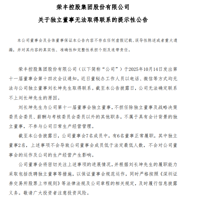 10月26日,*ST荣控(000668)公告称,公司近日无法与独立董事刘长坤取得联系。