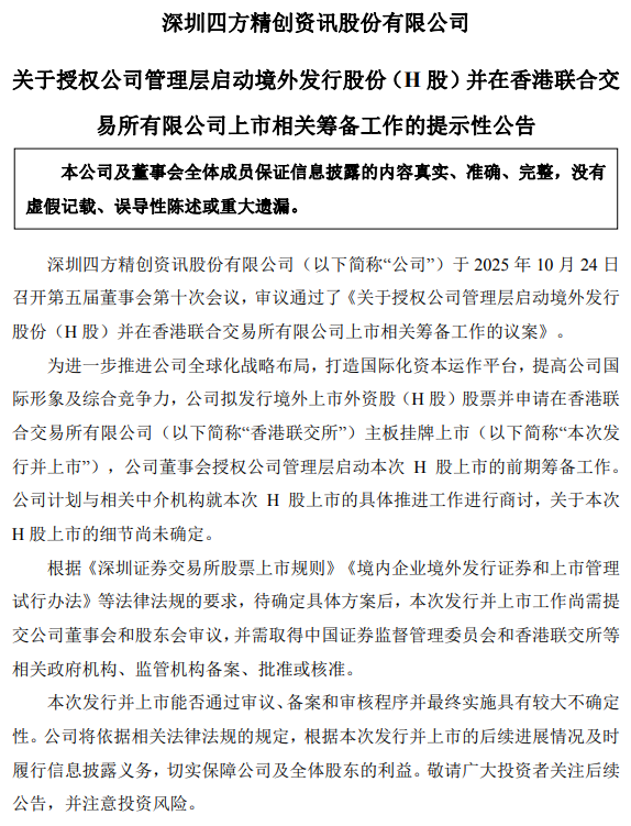 10月26日,四方精创发布公告称,公司于2025年10月24日召开董事会,审议通过授权管理层启动境外发行股份(H股)并在香港联交所主板挂牌上市的前期筹备工作。