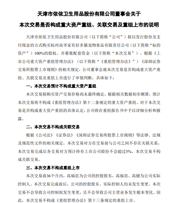 10月26日,依依股份公告称,公司正在筹划以发行股份及支付现金的方式取得杭州高爷家有好多猫宠物食品有限责任公司全部股权并募集配套资金,经向深圳证券交易所申请,公司股票自2025年10月27日(星期一)开市时起开始复牌。