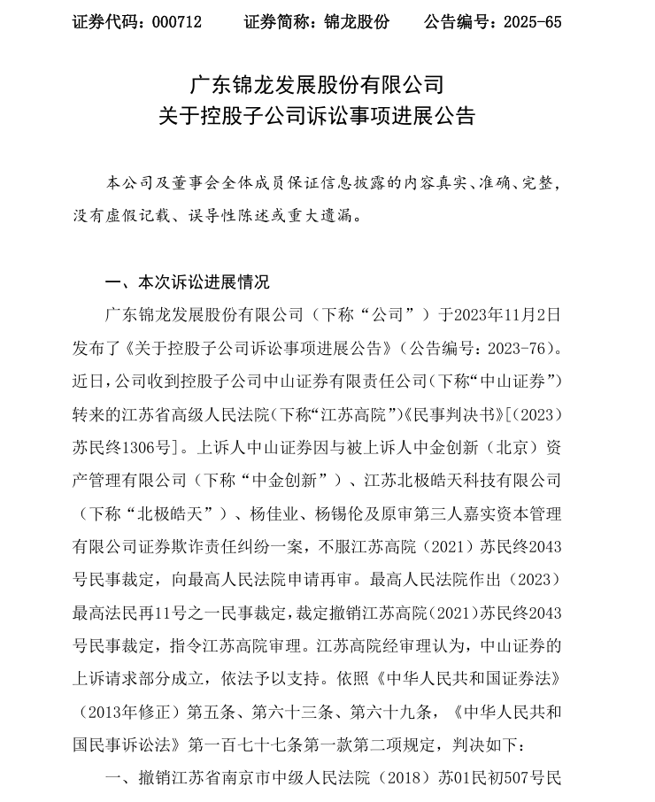 2025年,江苏高院作出终审判决:撤销前述南京中院的一审判决;确认中金创新对北极皓天享有债权2700万元;公司法定代表人杨佳业等对判决确认的第二项北极皓天债务承担连带赔偿责任;中山证券在30%范围内与北极皓天承担连带赔偿责任;驳回中金创新的其他诉讼请求。